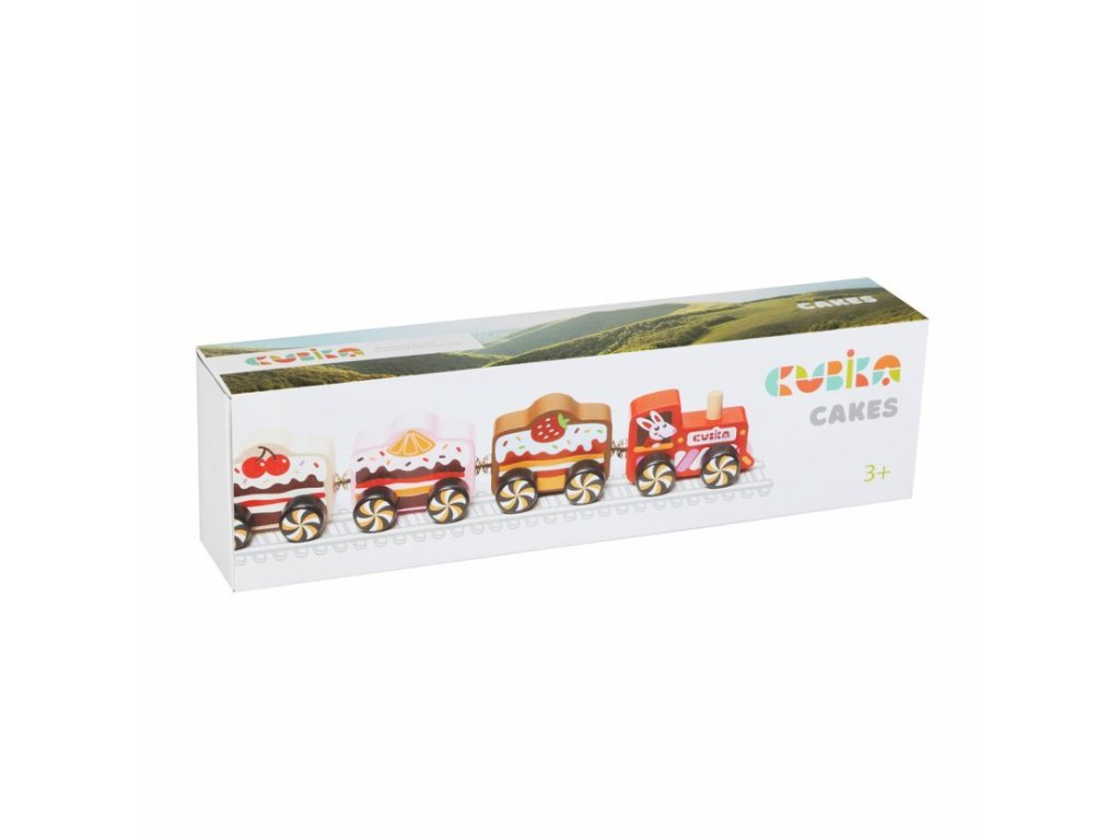 CUBIKA je nová značka dřevěných hraček vyrobených pouze z ekologicky pěstovaného dřeva s velmi precizním opracováním a líbivým designem. Vlak "Cakes" je 4 dílný dřevěný vláček v dívčím designu s magnety, které umožňují snadné propojení jednotlivých dílů. Sortiment hraček značky CUBIKA pomáhá dětem rozvíjet především senzomotorické schopnosti a dovednosti, logické myšlení, kreativitu, představivost a různé poznávací znalosti. Hračky jsou vyrobeny z nejkvalitnějšího javoru a buku a k barvení se používají též vysoce kvalitní barvy na vodní bázi, které jsou naprosto bezpečné pro děti a nemají žádný zápach. Všechny výrobky této značky mají německý certifikát TÜV a jsou vyrobeny dle evropské normy pro bezpečnost hraček EN 71. Doporučený věk od 3 let. Vyrobeno v Evropě.